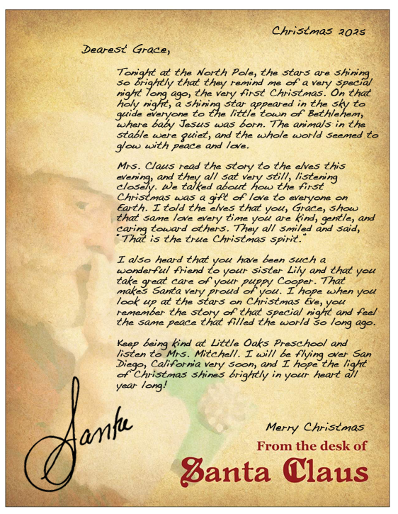 This letter from Santa can be personalized as much or as little as you'd like. Click PERSONALIZE THIS LETTER to use our Online Letter Editor to make changes and add your own details. You'll see a FREE FULL COLOR PREVIEW of your letter!